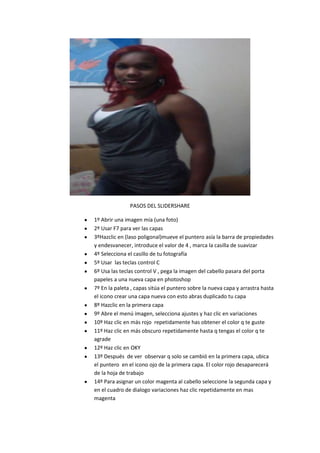 Este documento proporciona los pasos para usar las herramientas de capas y ajustes de color en Photoshop para cambiar el color del cabello en una foto mediante la creación de capas duplicadas y el ajuste independiente del color en cada capa. Los pasos incluyen seleccionar el cabello, duplicar la capa, y luego ajustar el color de cada capa por separado usando la herramienta de variaciones para lograr el color deseado.