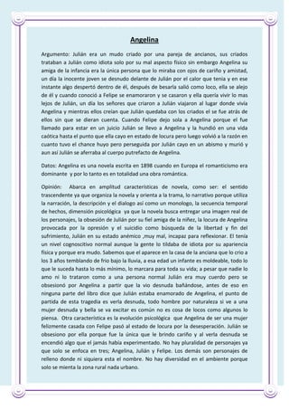 Este documento resume un análisis de la novela "Angelina" escrita por Carlos F. Gutiérrez en 1898. Describe la trama de la novela, la cual gira en torno a Julián, un mudo criado por ancianos que se obsesiona con su amiga de la infancia Angelina después de verla desnuda. Más tarde, cuando Angelina se casa con otro hombre, Julián la secuestra y la lleva a una vida caótica que termina enloqueciéndola y su muerte. El documento también analiza elementos de la novela como su car