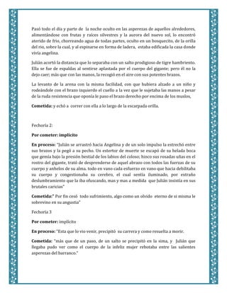 1) La historia trata sobre Julián, un hombre deformado que se enamora de Angelina pero ella se casa con otro hombre llamado Felipe. 2) Motivado por los celos y el amor frustrado, Julián planea vengarse de Angelina y Felipe. 3) A lo largo de la historia, Julián comete varios actos violentos en su intento de venganza, incluyendo secuestrar a Angelina.