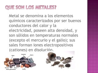 El documento resume las propiedades de los metales, incluyendo que son buenos conductores del calor y la electricidad, tienen alta densidad y son sólidos a temperatura normal. Explica que los metales se obtienen principalmente de minas mediante fundición y separación de las vetas metálicas de las formaciones rocosas con fuego o reactivos químicos. Además, describe brevemente las edades de Cobre, Bronce y Hierro en la historia de la humanidad.