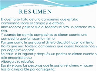 La historia trata de una pastora llamada Margarita que quería enriquecerse al igual que otra campesina que se hizo rica al coger unos rocotos dorados cerca de una laguna. Motivada por la codicia, Margarita iba con frecuencia a la laguna pero no veía los rocotos. Un día los vio y, obsesionada por cogerlos, se resbaló y cayó a la laguna ahogándose. Sus padres solo encontraron su rueca y rebaño.
