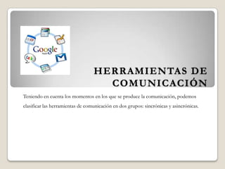 Las herramientas de comunicación se clasifican en sincrónicas y asincrónicas. Las sincrónicas como el chat permiten comunicación en tiempo real mientras que las asincrónicas como los foros no requieren que los participantes estén conectados al mismo tiempo. La comunicación asincrónica se caracteriza por ser independiente del lugar y el tiempo, mientras que la comunicación sincrónica depende de que los participantes coincidan en el tiempo.