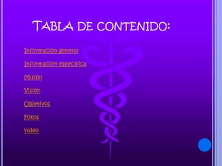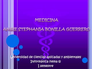 El documento presenta información general sobre un programa de pregrado de medicina de 12 semestres en la Universidad de Ciencias Aplicadas y Ambientales. Incluye su misión, visión y objetivos, los cuales se enfocan en la formación integral de médicos con énfasis en la atención primaria de la salud y el desarrollo humano y ambiental sostenible. También contiene fotos del campus universitario.