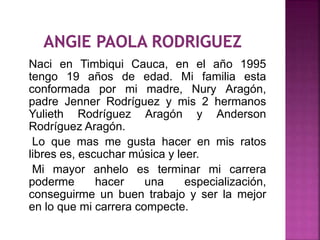 Este documento presenta las biografías de dos estudiantes de la Licenciatura en Educación para la Primera Infancia. Angie Paola Rodríguez nació en 1995 en Timbiqui, Cauca y actualmente tiene 19 años. Su familia está compuesta por su madre, padre y dos hermanos. Le gusta escuchar música y leer en su tiempo libre. Su mayor aspiración es terminar su carrera y especializarse para conseguir un buen trabajo. Indyra Fernanda Orobio nació en Buenaventura, Valle del Cauca y tiene 26