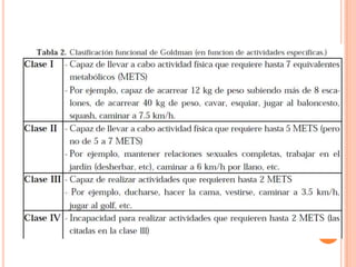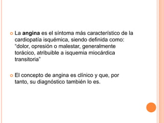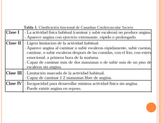El documento describe la angina de pecho estable, incluyendo su fisiopatología, diagnóstico y tratamiento. La angina de pecho estable se produce cuando la demanda de oxígeno del corazón excede el suministro de oxígeno a través de las arterias coronarias debido a placa aterosclerótica. El diagnóstico se basa en los síntomas del paciente y pruebas adicionales pueden incluir electrocardiogramas y pruebas de esfuerzo. El tratamiento involucra medicamentos como nitratos