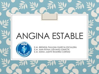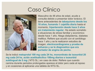 Se presenta el caso clínico de un hombre de 48 años diagnosticado con angina estable, tras sufrir dolor torácico asociado a ejercicio e estrés. Se discuten los antecedentes médicos del paciente, así como sus factores de riesgo, síntomas, diagnóstico y tratamientos recomendados, incluyendo medicamentos como metoprolol y estatinas. El documento también aborda las guías de diagnóstico y tratamiento de la cardiopatía isquémica crónica, enfatizando la importancia del control de factores de riesgo y el manejo adecuado de la angina estable.