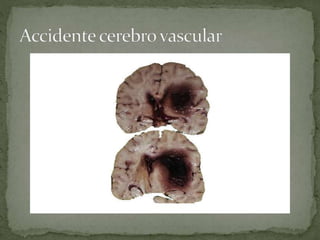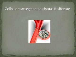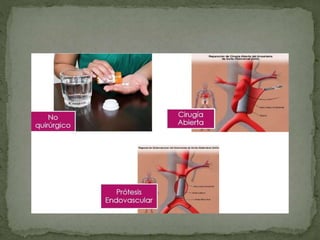 El documento define un aneurisma como una dilatación localizada e irreversible de un segmento de arteria que tiene al menos un 50% de aumento de diámetro comparado con la arteria normal. Explica que los principales factores de riesgo son la hipertensión, dislipidemia, tabaquismo, antecedentes familiares y defectos genéticos del tejido conectivo. Generalmente un aneurisma es asintomático pero puede causar dolor abdominal, lumbar, pulsaciones o vómitos. Para diagnosticarlo y tratarlo se realizan exámenes