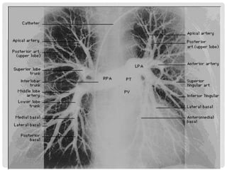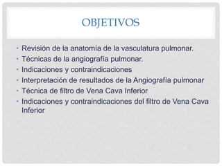 Este documento proporciona información sobre la angiografía pulmonar y los filtros de vena cava inferior. Explica la anatomía vascular pulmonar, técnicas de angiografía pulmonar, indicaciones y contraindicaciones. También describe la colocación y retiro de filtros de vena cava inferior, incluidas sus indicaciones, contraindicaciones y posibles complicaciones.