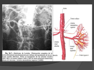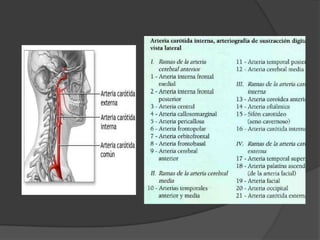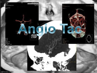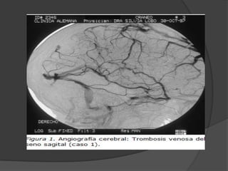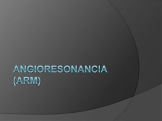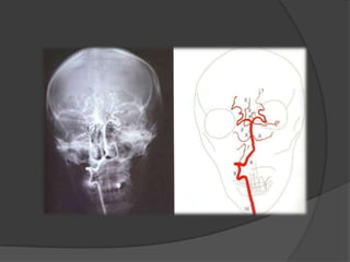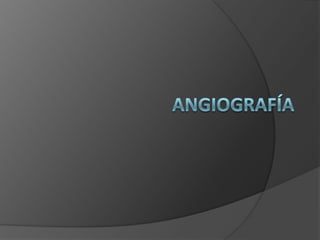 El documento presenta una introducción a la angiografía y su uso para estudiar la vascularización del sistema nervioso central y sus alteraciones. Describe el procedimiento de angiografía convencional y diferentes tipos de lesiones vasculares como aneurismas, estenosis, trombosis y embolias que pueden ser estudiadas con este método. También explica brevemente la angiografía por resonancia magnética, sus ventajas y casos en los que se utiliza comúnmente.