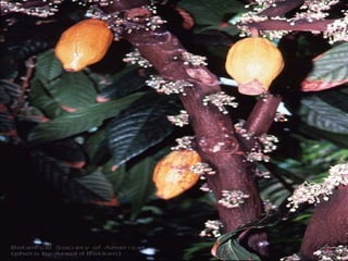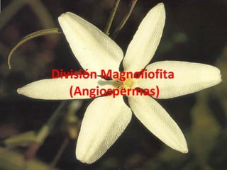 Este documento describe las características de las divisiones Magnoliophyta y Liliopsida. La división Magnoliophyta incluye las dicotiledóneas, las cuales tienen dos cotiledones, hojas con nerviación reticulada y polen tricopeltado. La división Liliopsida incluye las monocotiledóneas, las cuales tienen un cotiledón, hojas con nerviación paralela y polen de una sola apertura.