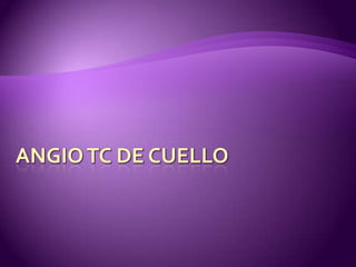 La tomografía computarizada (TC) es un método de diagnóstico no invasivo que utiliza rayos X y un medio de contraste para evaluar enfermedades vasculares, inflamatorias y tumores. Antes del estudio, el paciente debe ayunar por 6 horas y proporcionar antecedentes médicos. La TC del cuello comienza en la fosa posterior y captura imágenes cada 5 mm hasta los pulmones. El escaneo se optimiza usando un sistema llamado Smart prep para asegurar que los órganos se visualicen con el mejor