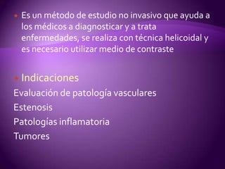 Este documento describe los fundamentos y procedimiento de una tomografía computarizada (TC) del cuello. La TC es un método de diagnóstico no invasivo que utiliza rayos X y contraste para evaluar patologías vasculares, tumores e inflamaciones en el cuello. Se requiere ayuno, consentimiento informado y optimización del contraste mediante un dispositivo llamado "Roy" para obtener imágenes óptimas de la región del cuello.