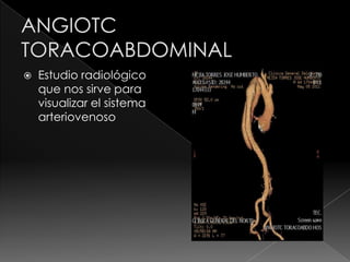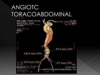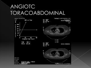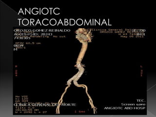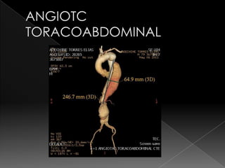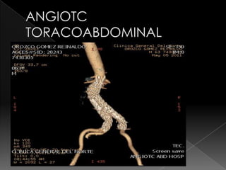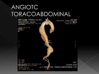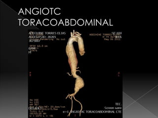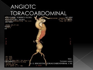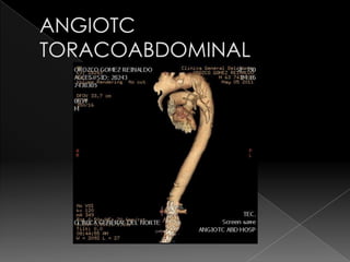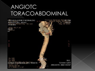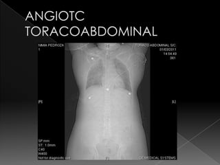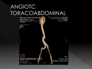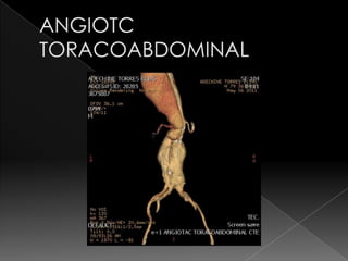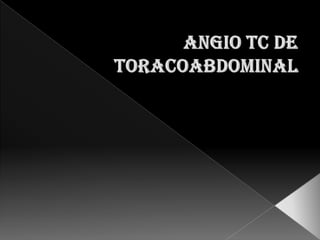 Un TC toracoabdominal permite visualizar el sistema arteriovenoso. Se usa para diagnosticar anomalías coronarias, monitorear revascularización miocárdica, evaluar dolor torácico atípico y stents. Requiere creatinina menor a 2, ayuno de 6-8 horas y no contraste oral. El paciente se coloca en decúbito supino en el gantry y se toman imágenes desde la orquilla esternal hasta la sínfisis púbica para reconstruir en 3D y evaluar stents, aneurismas y trauma aórtico