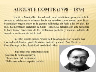 Este documento presenta información sobre Auguste Comte y el positivismo. Comte fue un filósofo francés que desarrolló el positivismo, una filosofía basada en el conocimiento empírico obtenido a través de la observación y la experiencia. El positivismo sostiene que sólo se puede conocer aquello que es observable y comprobable a través de la ciencia. El documento también resume las principales características y corrientes del positivismo.