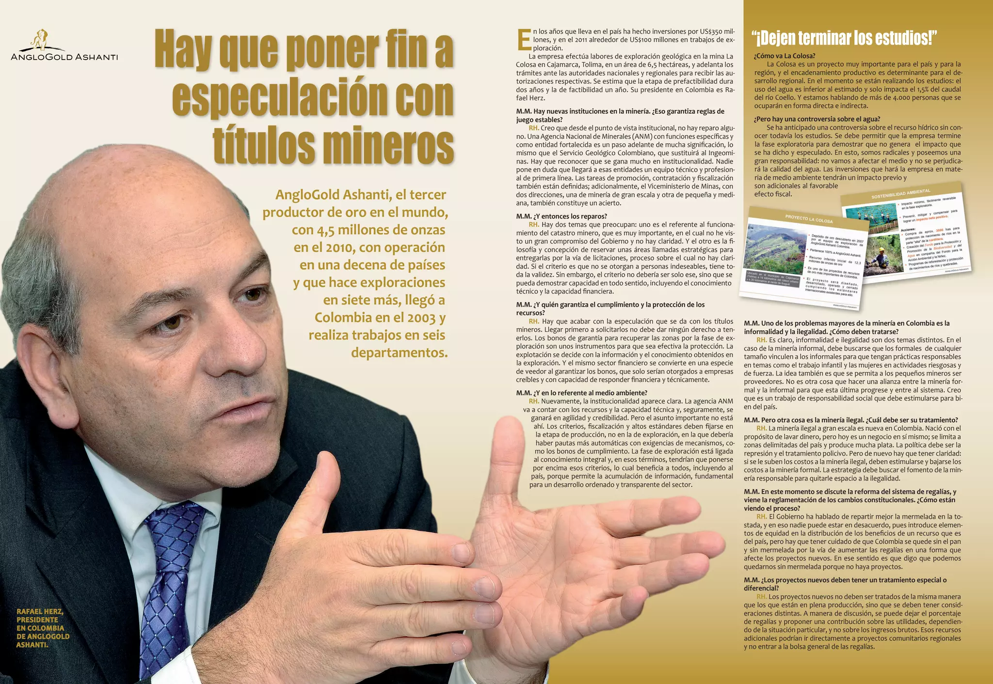 AngloGold Ashanti es el tercer productor mundial de oro y opera en Colombia desde 2003, realizando exploraciones en seis departamentos. Rafael Herz, presidente de AngloGold en Colombia, discute varios temas relacionados con la minería en el país, incluyendo las nuevas instituciones mineras, controversias sobre el uso del agua, formalización de la minería informal, tratamiento de la minería ilegal, y reformas al sistema de regalías.