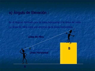 El documento describe los ángulos verticales de elevación y depresión. El ángulo de elevación se forma entre la línea horizontal y la línea de mira cuando esta está por encima de la horizontal. El ángulo de depresión se forma cuando la línea de mira está por debajo de la horizontal. Se proveen dos ejemplos para calcular alturas y distancias usando ángulos verticales y la tangente.
