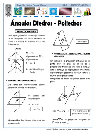 Este documento presenta información sobre diversos temas de geometría moderna como ángulos diedros, poliedros, poliedros regulares y teoremas relacionados. Incluye definiciones, ejemplos y ejercicios resueltos sobre estos temas. El documento fue elaborado por dos estudiantes de la Facultad de Educación de la Universidad Nacional Federico Villarreal para el curso de Geometría Moderna.