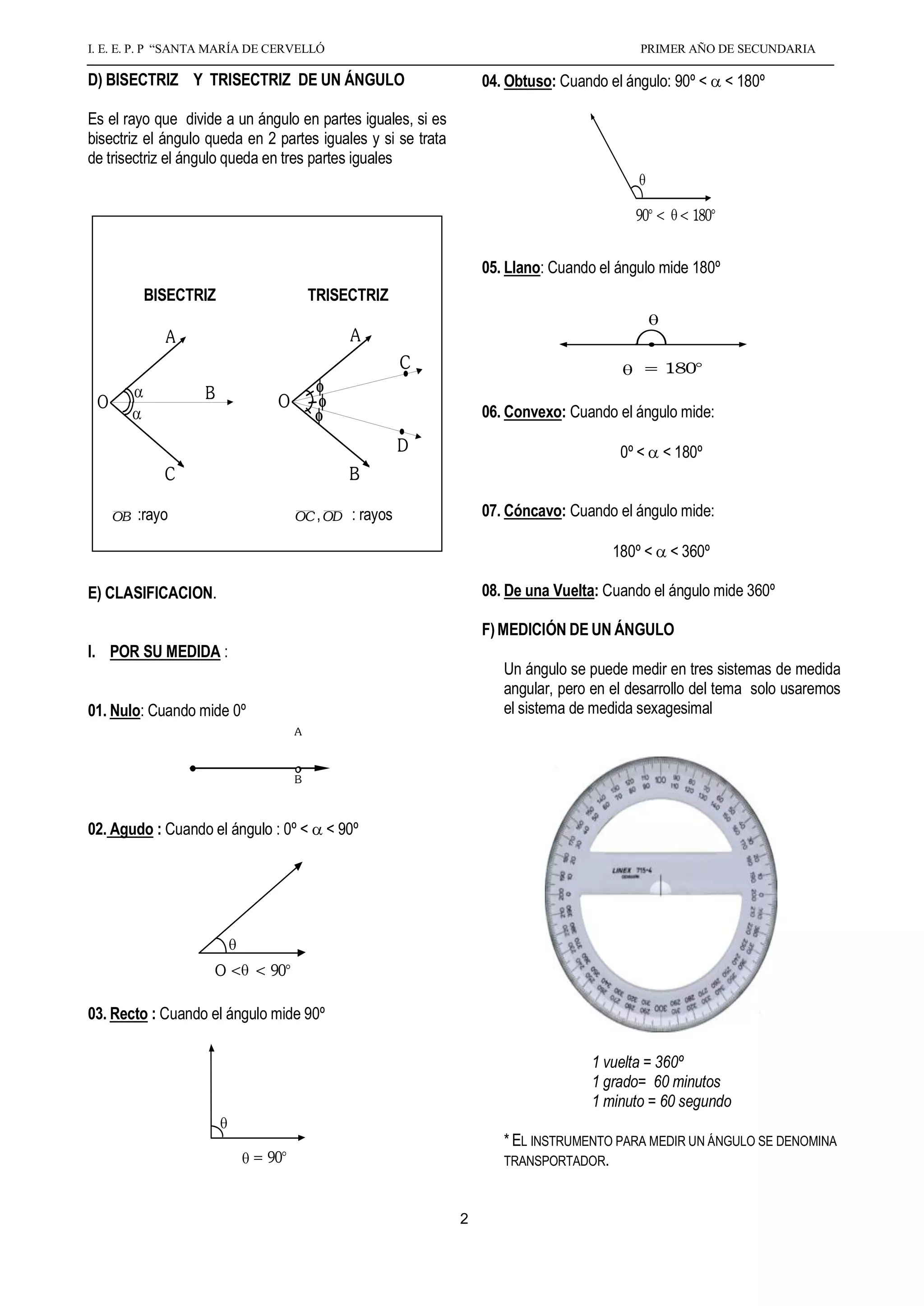 El documento presenta información sobre ángulos planos, incluyendo su definición, elementos, clasificación, medición, propiedades y operaciones. Define un ángulo como la inclinación mutua de dos líneas que se encuentran en un plano y no están en línea recta. Explica los tipos de ángulos (agudo, recto, obtuso, etc.), y cómo medir ángulos usando el sistema sexagesimal de grados, minutos y segundos. También cubre propiedades de ángulos adyacentes, opuestos por el vértice, complementarios