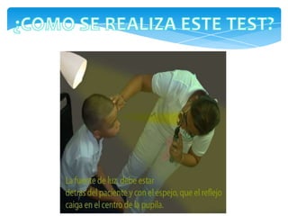 Este documento describe cómo realizar la prueba de Hirschberg para medir los ángulos de desviación ocular. La prueba involucra hacer que el paciente fije un punto de luz y medir dónde cae el reflejo de la luz en la córnea para cada ojo. La desviación se mide en grados y puede indicar condiciones como exotropía, endotropía, hipertropía e hipotropía. El documento también explica cómo registrar y anotar los resultados obtenidos.
