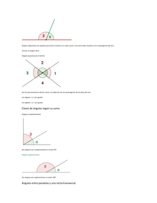 Este documento clasifica y describe diferentes tipos de ángulos según su medida (agudo, recto, obtuso, convexo, llano, cóncavo, nulo y completo), posición (consecutivos, adyacentes y opuestos por el vértice) y suma (complementarios y suplementarios). También explica los ángulos formados entre paralelas y una recta transversal, incluyendo ángulos correspondientes, alternos internos y externos.