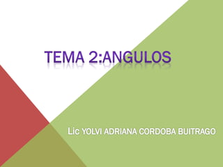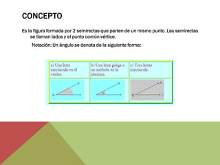 El documento habla sobre ángulos y diferentes tipos como complementarios, suplementarios y entre rectas paralelas. Explica definiciones, ejemplos y ejercicios sobre hallar ángulos dados otros datos como su medida u otros ángulos relacionados. También cubre conversiones entre grados, minutos, segundos y radianes.