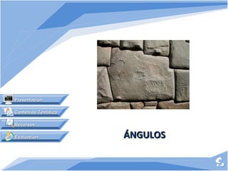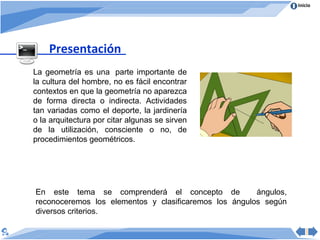 El documento trata sobre los ángulos. Explica que un ángulo se forma por dos rayos que parten de un punto común llamado vértice. Luego clasifica los ángulos de acuerdo a su medida en agudos, rectos, obtusos, llano y no convexos. También los clasifica según su posición en adyacentes, consecutivos y opuestos. Finalmente, presenta propiedades de ángulos formados cuando dos rectas son cortadas por una secante.