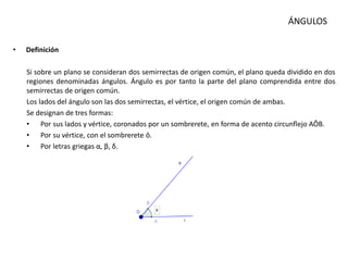 Los ángulos se forman entre dos semirrectas con un origen común y se miden en grados. Existen dos sistemas para medir ángulos: el sexagesimal que divide el cuarto de circunferencia en 90 partes y el centesimal que lo divide en 100. Los ángulos pueden ser llanos, convexos como rectos, agudos u obtusos, o cóncavos. Los ángulos también se clasifican según su suma, como complementarios o suplementarios, o según su posición, como consecutivos, adyacentes u opuestos.