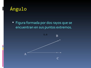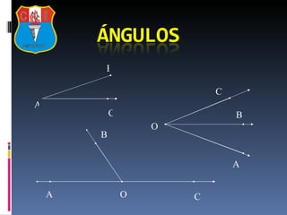 El documento define los ángulos, sus elementos, clasificaciones y propiedades. Explica que un ángulo es la figura formada por dos rayos que se encuentran, con vértice en el punto de encuentro. Define los tipos de ángulos (agudo, recto, obtuso y llano) y postula que la suma de los ángulos internos de un triángulo es 180 grados. También cubre conceptos como ángulos adyacentes, opuestos, bisectriz y formados por rectas paralelas.