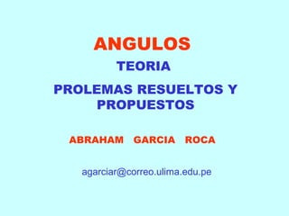 Este documento presenta la teoría de los ángulos y resuelve problemas relacionados. Explica los diferentes tipos de ángulos según su medida, posición y relación. También cubre las propiedades de los ángulos entre dos rectas paralelas y una recta secante. Al final, propone 13 problemas para calcular medidas de ángulos usando estas propiedades y da sus respuestas.