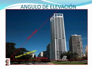 El documento habla sobre los ángulos de elevación y depresión. Define el ángulo de elevación como el formado entre una línea visual y la horizontal debajo de ella. Define el ángulo de depresión como el formado entre una línea visual y la horizontal encima de ella. Luego propone algunos ejemplos y ejercicios para practicar el cálculo de distancias y alturas usando estos ángulos.