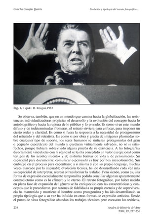 La evolución del retrato fotográfico se ha visto influenciada por el fotoperiodismo y la fotografía de identificación, dando lugar a diferentes tipos de retratos. El documento describe los pioneros del retrato fotográfico y cómo evolucionó de un enfoque en el reconocimiento físico a retratos más psicológicos y experimentales. También discute cómo el retrato fotográfico ha mantenido al ser humano como sujeto central mientras desarrolla su propia tipología.
