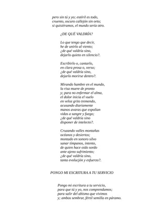 Este documento contiene varios poemas cortos sobre temas como la paz, la naturaleza, la justicia social y la esperanza. Los poemas expresan ideas como la necesidad de unirse para construir un mundo mejor sin violencia ni sufrimiento.