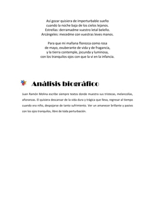 El poema expresa el anhelo del autor de encontrar un profundo sueño y olvido que le permita escapar de sus penas y problemas. Desea regresar a la inocencia de la infancia y descansar sin preocupaciones como la piedra o la hiedra. El análisis señala que Juan Ramón Molina suele escribir sobre sus tristezas y añoranzas, y que en este poema desea descansar de su dura vida regresando a la tranquilidad de su niñez.