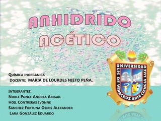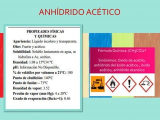 Este documento proporciona información sobre el anhídrido acético, incluyendo sus propiedades peligrosas, equipo de seguridad requerido para su manejo, primeros auxilios en caso de exposición, almacenamiento apropiado y códigos NFPA. El anhídrido acético es corrosivo, inflamable y reactivo con el agua. Se debe usar equipo como gafas y guantes protectores para evitar daños a la piel y ojos.