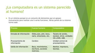 Este documento compara el cuerpo humano y la computadora como sistemas. Explica que ambos son sistemas compuestos de varias partes que trabajan juntas para realizar funciones. Describe las partes de entrada, procesamiento y salida de información tanto en el cuerpo humano como en la computadora. También define términos clave como hardware, software, datos e informática.