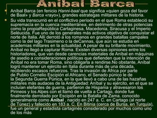Aníbal Barca fue un gran general cartaginés del siglo III a.C., conocido por sus victorias sobre los romanos en la Segunda Guerra Púnica. Nació en Cartago en el 247 a.C. y lideró un ejército, incluyendo elefantes, a través de los Pirineos y los Alpes para invadir Italia. Derrotó a los romanos en batallas como el Lago Trasimeno y Cannas, pero no pudo capturar Roma. A pesar de mantener un ejército en Italia durante más de una década, fue