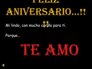 Este documento es una carta de aniversario de una pareja. En ella, la persona expresa su amor por su pareja después de un año juntos, destacando cómo se enamoraron a primera vista, han superado varias pruebas juntos, y cómo se han convertido en una sola persona debido a su gran amor sincero y único. También agradece los detalles y creaciones con las que su pareja le ha demostrado su amor.