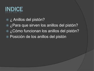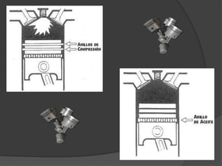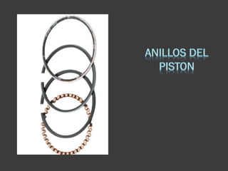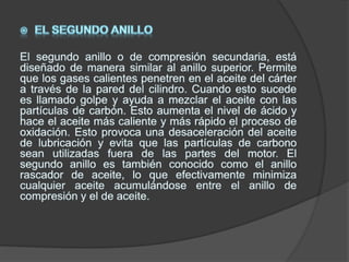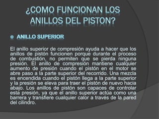 Los anillos del pistón sellan la cámara de combustión para que los gases no escapen entre el pistón y el cilindro durante la expansión y compresión. También ayudan a transferir calor del pistón a la pared del cilindro y regular el flujo de aceite en el motor. Generalmente hay tres anillos: uno grueso para sellar, uno delgado para limpiar y uno delgado para regular el aceite. Sus aberturas deben alinearse correctamente.