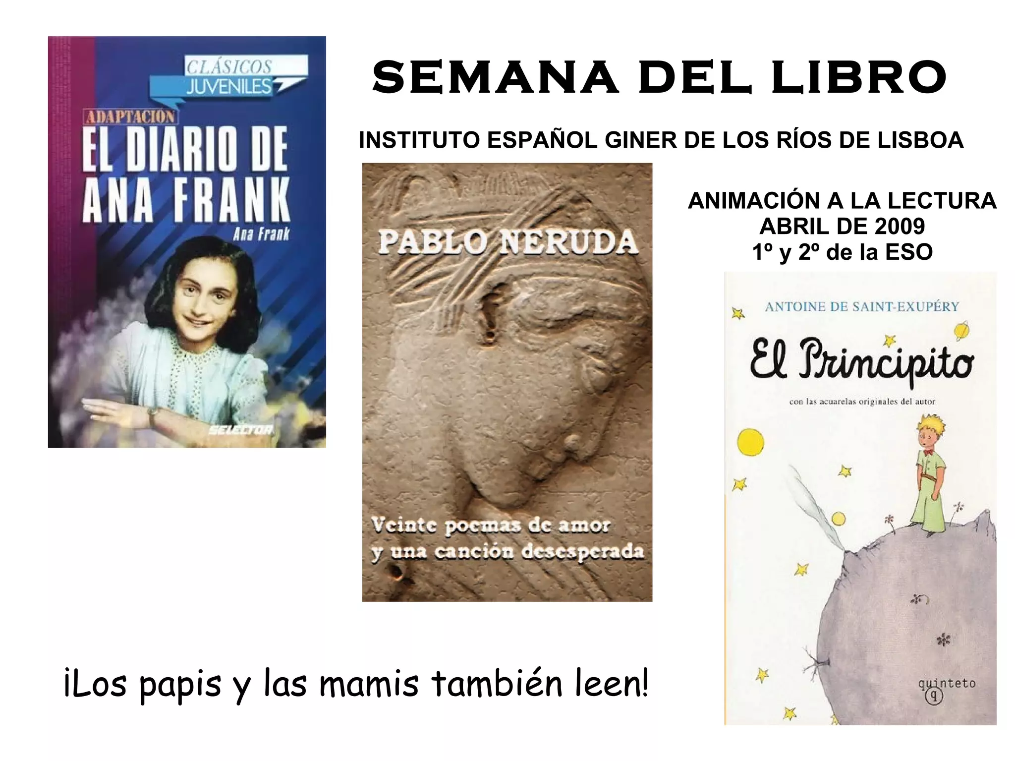 La semana del libro en el Instituto Español Giner de los Ríos de Lisboa se celebró en abril de 2009, enfocándose en la animación a la lectura para los estudiantes de 1º y 2º de la ESO. Se destacó la participación de padres, fomentando un ambiente donde '¡los papis y las mamis también leen!'. El evento busca promover el interés por la lectura entre los jóvenes.
