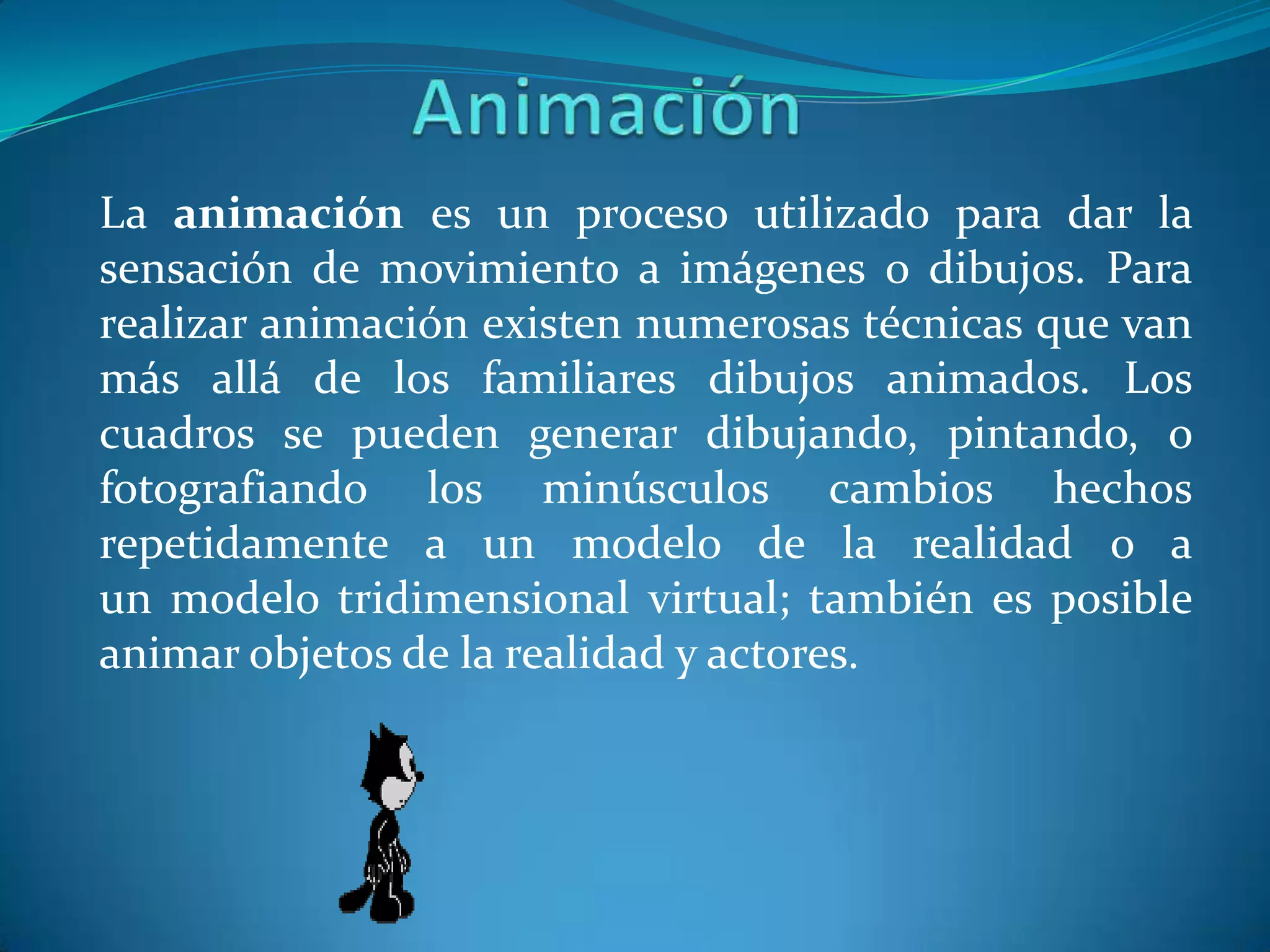 La animación da la sensación de movimiento a imágenes o dibujos mediante técnicas como dibujar, pintar o fotografiar pequeños cambios repetidamente. Es un trabajo tedioso que generalmente realizan compañías de animación. Existen dos tipos principales: la animación completa con 24 imágenes por segundo y la animación limitada con menos imágenes por segundo, como el estándar de 8 imágenes por segundo del animé japonés.