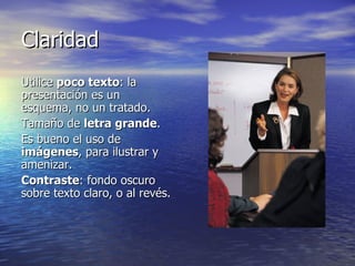 Este documento ofrece recomendaciones para realizar presentaciones efectivas con OpenOffice, incluyendo mantener poco texto con letras grandes, usar imágenes y contrastes, destacar ideas clave con gráficos y listas, y hablar al público en lugar de leer las diapositivas. También recomienda desarrollar la presentación en etapas como escribir el esquema, agregar diseño, escribir notas, probarla y publicarla.