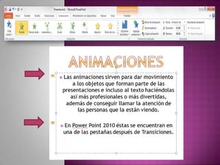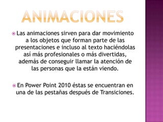 Este documento describe cómo agregar y modificar animaciones en PowerPoint 2010. Explica que las animaciones se encuentran en una pestaña y se asignan números a los objetos animados. Detalla que se pueden definir los intervalos de inicio de las animaciones y su duración. También cubre cómo agregar múltiples animaciones y los diferentes tipos representados por colores como entrada, énfasis y salida.