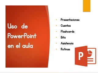Este documento proporciona instrucciones para utilizar PowerPoint en el aula de manera interactiva. Explica cómo crear presentaciones, cuentos, flashcards y actividades utilizando animaciones, efectos de sonido y trayectorias. También recomienda usar formatos .png y ocultar diapositivas para crear hipervínculos que permitan navegar entre las diapositivas de forma no lineal.