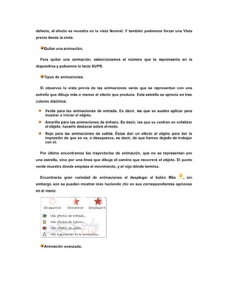 Este documento describe cómo añadir animaciones y transiciones a diapositivas de presentaciones para hacerlas más atractivas. Explica cómo seleccionar y personalizar animaciones para objetos y texto, y cómo establecer su orden y duración. También cubre las opciones para transiciones entre diapositivas, como sonido, duración y disparadores de cambio. El objetivo es proporcionar movimiento y efectos visuales para captar mejor la atención de la audiencia.