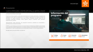 El programa de Tecnólogo Virtual en Animación Digital del SENA ofrece formación para realizar productos animados digitales siguiendo estándares de la industria del entretenimiento. Los estudiantes aprenden técnicas de animación 2D y pueden desempeñarse en la producción audiovisual. El programa busca proveer personal calificado a la industria y oportunidades laborales a los aprendices.