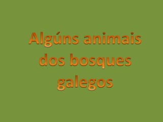 El documento lista diferentes animales de Galicia como el raposo, cabra montesa, corzo, xabarín, lobo, teixugo, águila, paspallás, pita do monte, corvo, pega, píntega, tritón, lagarta, víbora, cobra y vacaloura ou esconabois. Añade que todos los materiales presentados tienen propósito educativo y están hechos sin ánimo de lucro usando imágenes de Internet, y que si algún propietario se sintiera perjudicado por su inclusión