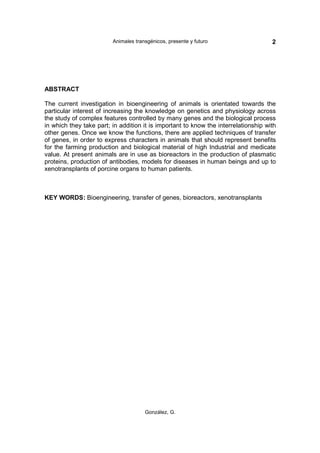 La investigación actual en bioingeniería animal busca aumentar el conocimiento sobre la genética y fisiología de los animales a través del estudio de rasgos controlados por múltiples genes y procesos biológicos, así como entender su interacción con otros genes. Una vez comprendidas estas funciones, se aplican técnicas de transferencia de genes para expresar características en los animales que representen beneficios para la producción agropecuaria y material biológico de alto valor industrial y médico,