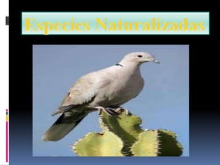 El documento habla sobre diferentes tipos de especies como endémicas, nativas, naturalizadas, introducidas y en peligro de extinción. Explica que las especies endémicas solo se encuentran en una región en particular, mientras que las especies nativas pertenecen naturalmente a una región. Las especies introducidas han sido transportadas a una nueva ubicación por actividades humanas y pueden dañar los ecosistemas. Las especies en peligro de extinción corren un alto riesgo de desaparecer globalmente debido a factores como