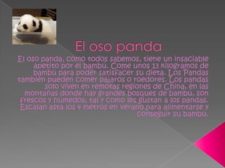 El documento presenta información sobre diferentes animales. Habla sobre las características del delfín, el oso panda y su dieta basada en bambú, las focas y su hábitat en los océanos polares, las diferencias entre las guacamayas de Centroamérica y Sudamérica, un método orgánico para alimentar conejos, el origen del nombre "hámster", la elegancia de los gatos, la lealtad de los perros hacia los humanos, la gran diversidad de especies de pájaros, y la distribución y p