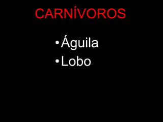 El documento lista diferentes tipos de animales agrupados por su dieta, hábitat y otras características. Incluye información sobre las dimensiones y peso típicos de especies carnívoras como el lobo y el águila, herbívoros como el caballo y el elefante, voladores como la cigüeña y la gaviota, acuáticos como el delfín y el león marino, y primates como el gorila y el orangután.